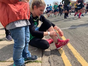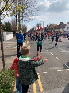 Around mile 8-10 I noticed that I had a small rock in my left shoe, but it was just jiggling around my toes and not causing me any issues, so I just kept on running.  I took my second gel around mile 10, and it made me feel quite full, and I felt thirsty, but didn’t feel like I could drink without getting a stitch and making myself feel even more full.  As we started to come back into Brighton, it that stupid rock had wiggled it’s way under the ball of my left foot 😧.  By the half way point it was quite sore, but there were so many crowds I didn’t really want to stop.