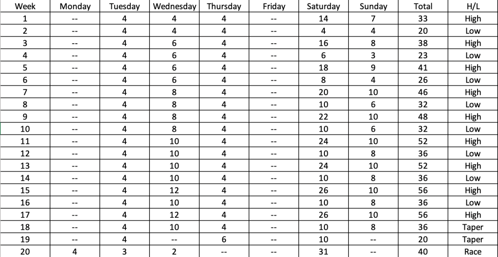 So what is a high-low training plan? Basically, you have one high mileage week (on), followed directly by a low mileage week (off). On, off, on, off, and so on. The high mileage weeks are double long run weekends, and the low mileage weeks are double mid-distance run weekends. And guess what, I love it ❤️.